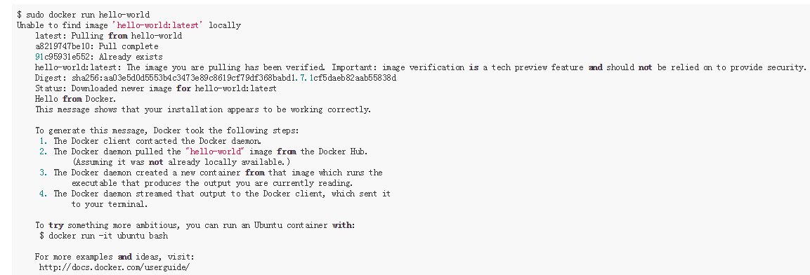 $ sudo docker run hello-world
