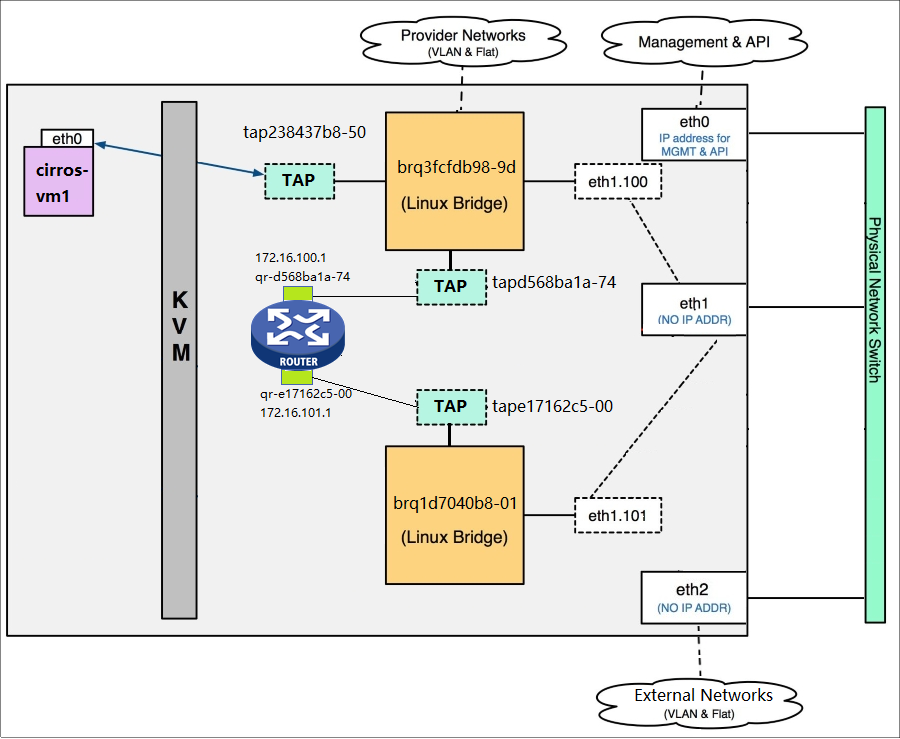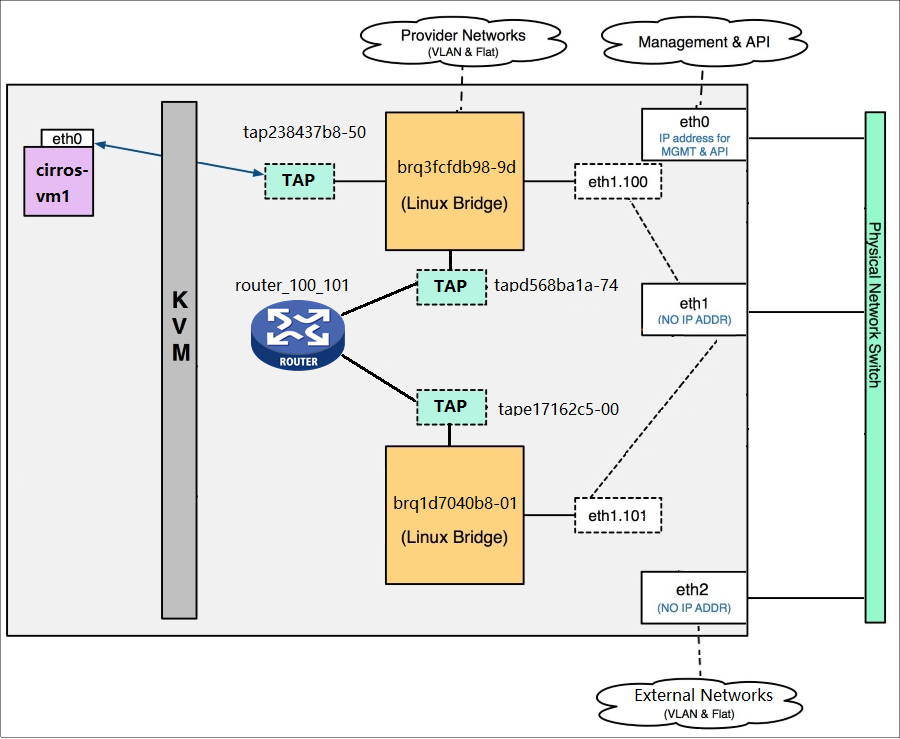 vlan100 的 bridge 上多了一个 tapd568ba1a-74,从命名上可以推断该 TAP 设备对应 router_100_101 的 interface (d568ba1a-740e)。