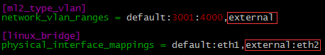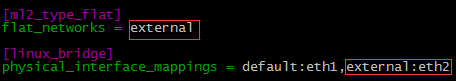 这里我们将外部网络的 label 命名为 “external”。 如果类型为 flat,控制节点 /etc/neutron/plugins/ml2/ml2_conf.ini 配置如下: