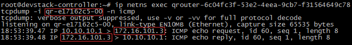 2. 当 cirros-vm3 发送数据到外网,源地址 172.16.101.3 将被修改为 floating IP 10.10.10.3。