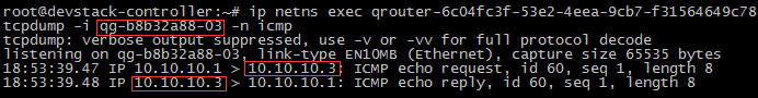 可见,在外网接口 qg-b8b32a88-03 上,始终是通过 floating IP 10.10.10.3 与外网通信。