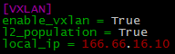 local_ip 指定节点上用作 VTEP 的 IP 地址。 devstack_controller 的 VTEP IP 是 166.66.16.10,网卡为 eth1。 devstack_compute01 的 VTEP IP 是 166.66.16.11,网卡为 eth1。