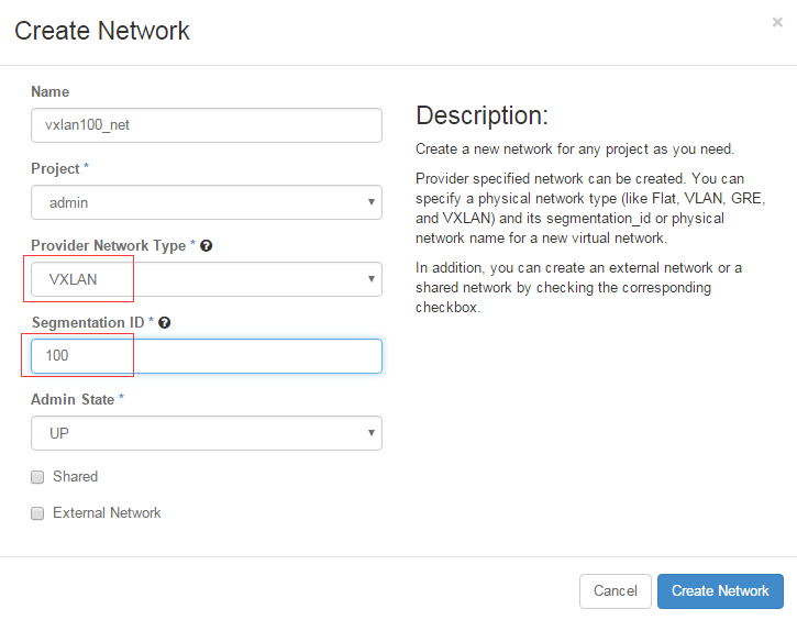 Provider Network Type 选择 “VXLAN” Segmentation ID 即 VNI,设置为 100