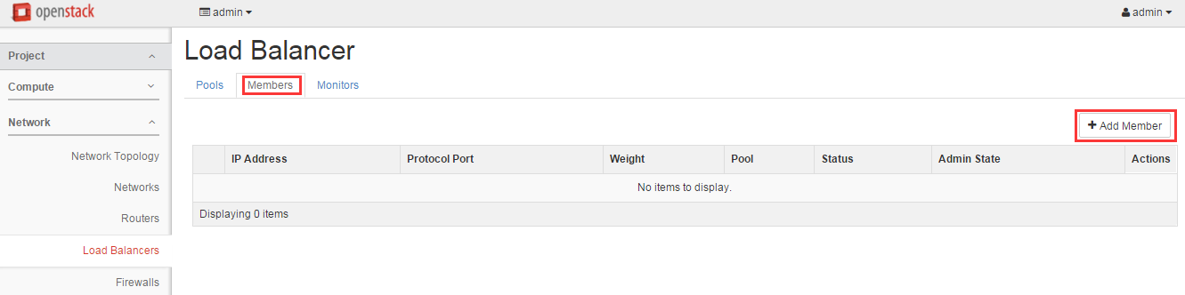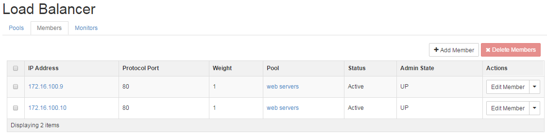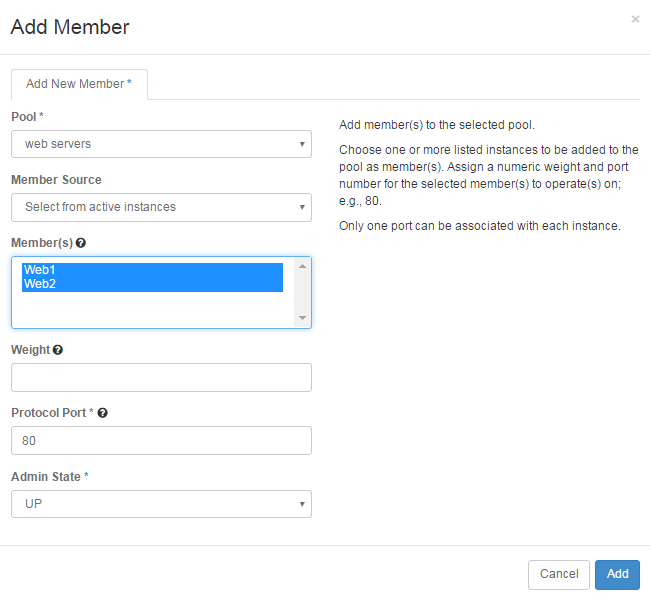 “Web1” 和 “Web2” 准备就绪了,可以添加到 Pool 中了。 在 Project -> Network -> Load Balancers 的 Members 标签页中 点击 “Add Member” 按钮。