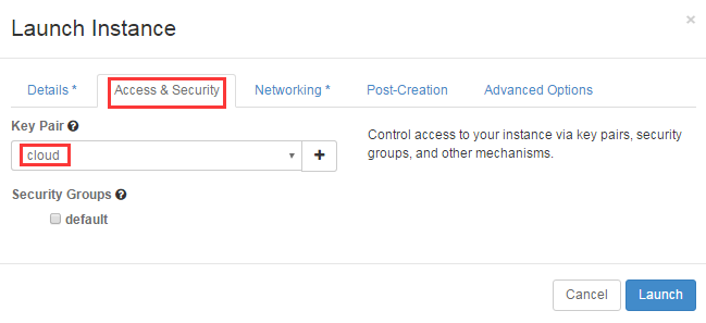 使用 Key Pair “cloud”。 launch instance 的时候,在 Access & Security 标签页中选择 Key Pair “cloud”。 OpenStack 会自动将公钥添加进 instance 的 ~/.ssh/authorized_keys 文件。