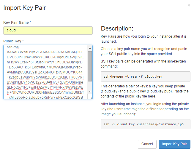 粘贴到 Public Key 输入框中,给 Key Pair 命名为 “cloud”,并点击 “Import Key Pair”。