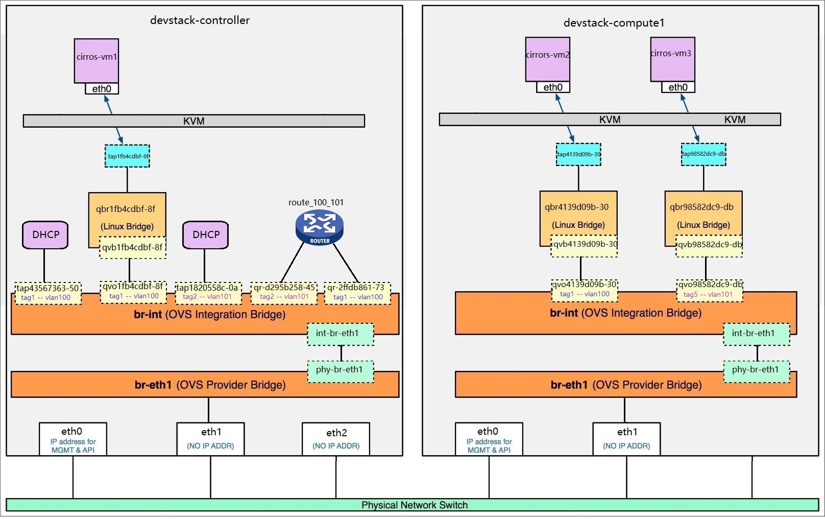 与 linux bridge 实现方式一样, router_100_101 运行在自己的 namespace 中。