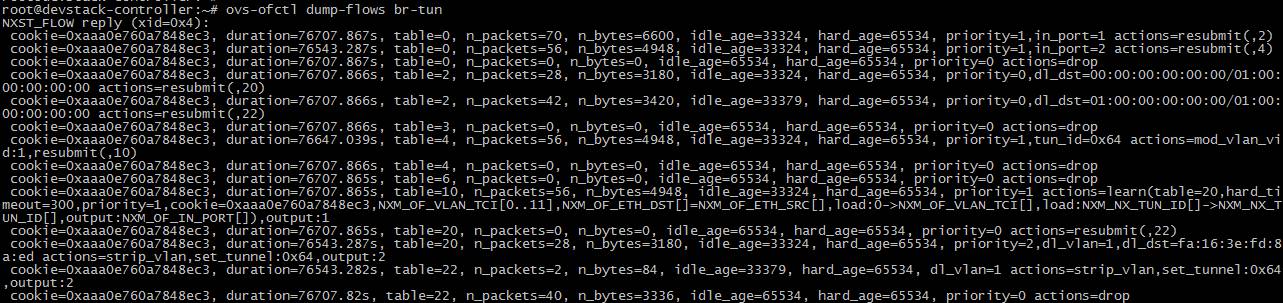 cookie=0xaaa0e760a7848ec3, duration=76707.865s, table=10, n_packets=56, n_bytes=4948, idle_age=33324, hard_age=65534, priority=1 actions=learn(table=20,hard_timeout=300,priority=1,cookie=0xaaa0e760a7848ec3,NXM_OF_VLAN_TCI[0..11],NXM_OF_ETH_DST[]=NXM_OF_ETH_SRC[],load:0->NXM_OF_VLAN_TCI[],load:NXM_NX_TUN_ID[]->NXM_NX_TUN_ID[],output:NXM_OF_IN_PORT[]),output:1