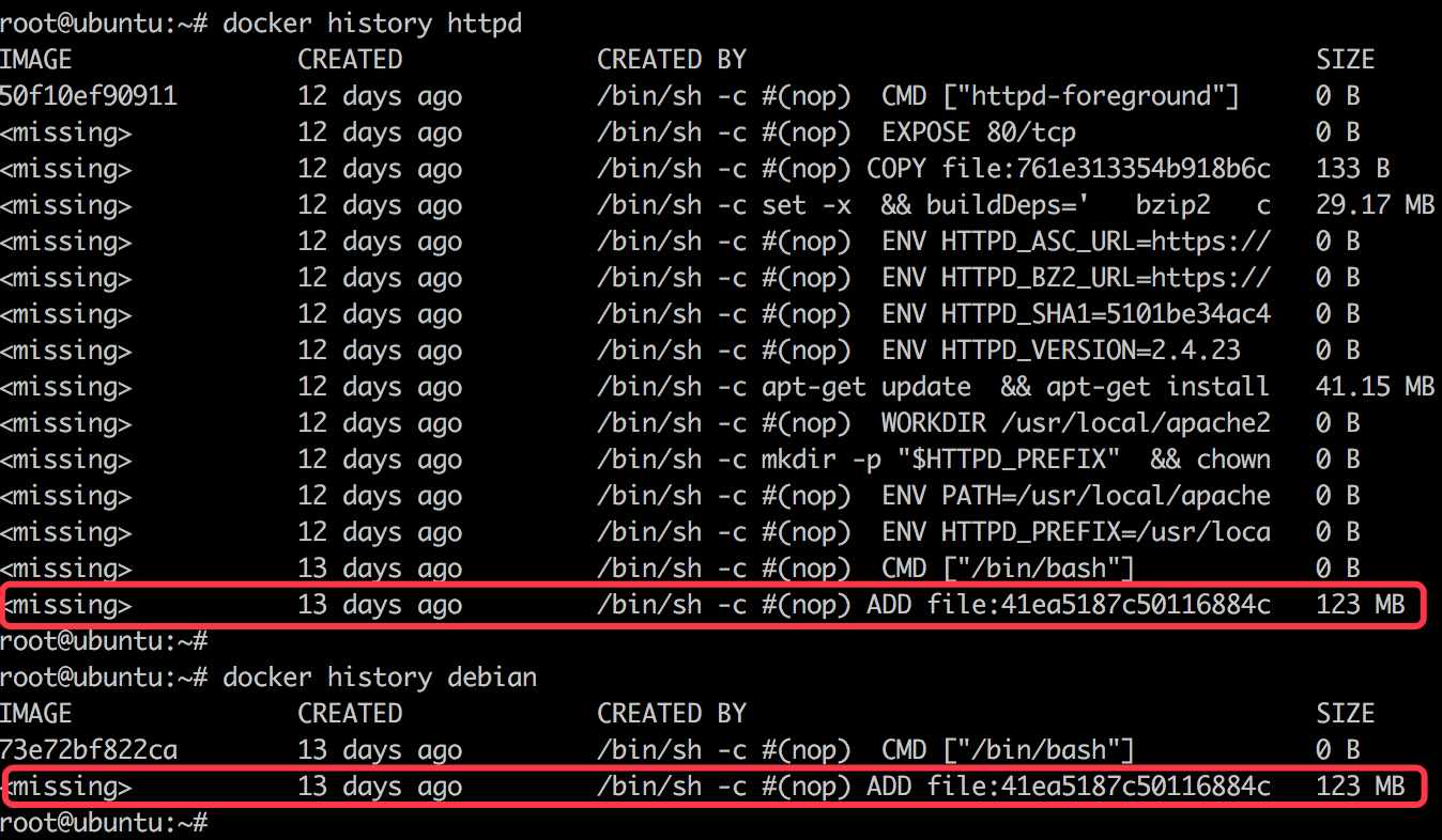 由 Dockerfile 可知 httpd 的 base 镜像为 debian,正好之前已经下载过 debian 镜像,所以有缓存可用。通过 docker history 可以进一步验证。