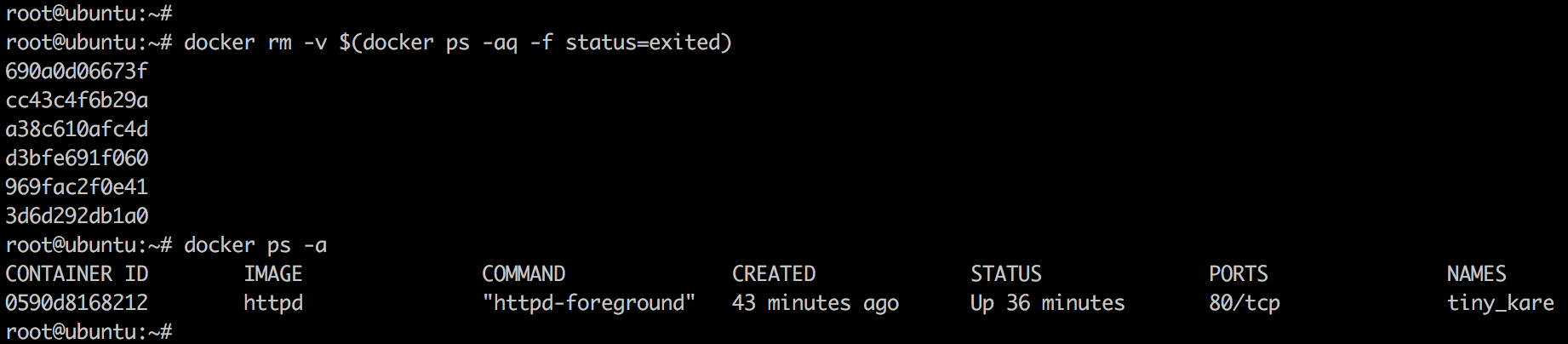 docker rm 一次可以指定多个容器,如果希望批量删除所有已经退出的容器,可以执行如下命令: