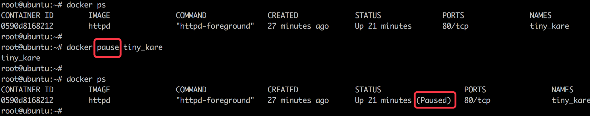 有时我们只是希望暂时让容器暂停工作一段时间,比如要对容器的文件系统打个快照,或者 dcoker host 需要使用 CPU,这时可以执行 docker pause。
