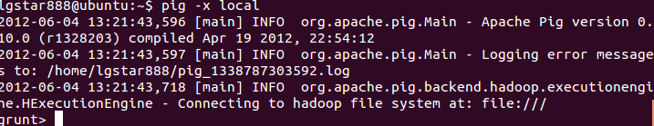 grunt> log = LOAD '/home/lgstar888/hadoop/pig-0.10.0/tutorial/data/excite-small.log' AS (user:chararray,time:long,query:chararray);