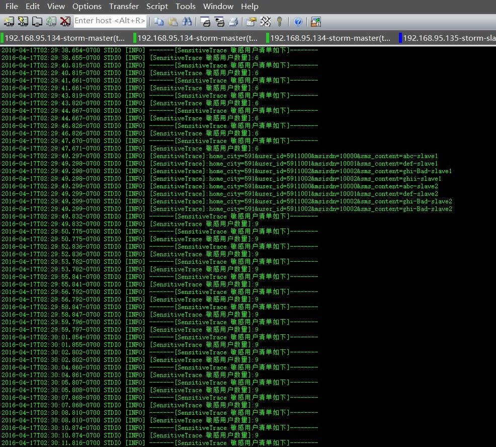 我们可以很清楚的看到:Spouts组件(用户短信采集器):SensitiveFileReader591、SensitiveFileReader592的线程数executors、任务提交emitted情况。以及Bolts组件:监控短信内容拆解分析器(SensitiveFileAnalyzer)、敏感信息采集处理(SensitiveBatchBolt)的运行情况,这样监控起来就非常方便。除此之外,我们还可以到对应的Supervisor服务器对应的Storm安装目录下面的logs目录,查看一下worker的工作日志,我们来看下敏感信息监控过滤的处理情况,截图如下: