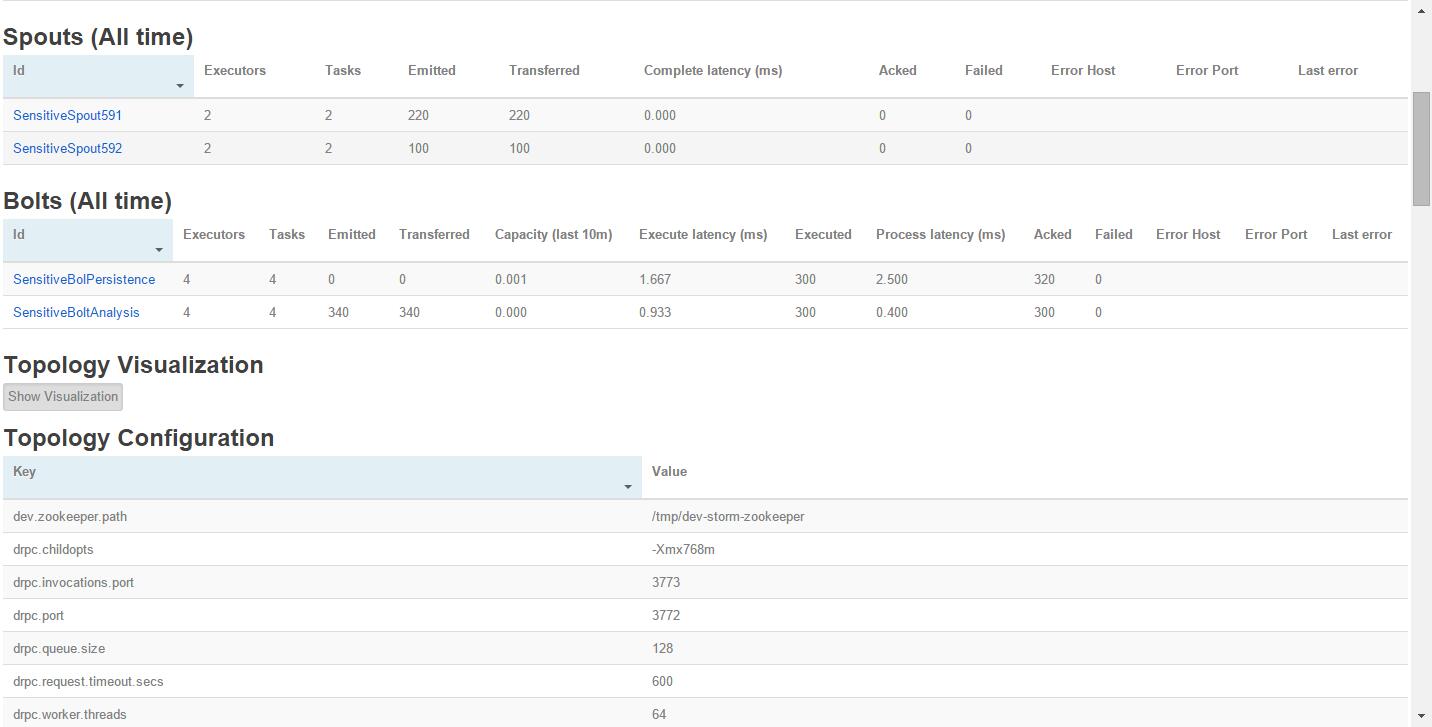 可以看到我们刚才提交的拓扑:SensitiveTopology已经成功提交到Storm集群里面了。这个时候,你可以鼠标点击SensitiveTopology,然后,会打开如下的一个Spouts/Bolts的监控界面,如下图所示: