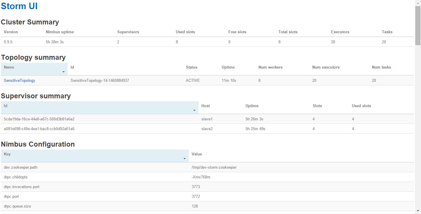 比如我这里是输入:storm jar /home/tj/install/SensitiveTopology.jar newlandframework.storm.topology.SensitiveTopology,然后,把疑似垃圾短信用户的垃圾短信内容文件放到指定的服务器下面的目录(/home/tj/data/591、/home/tj/data/592),最后,打开刚才的Storm UI,观察任务的启动执行情况,这里如下图所示:
