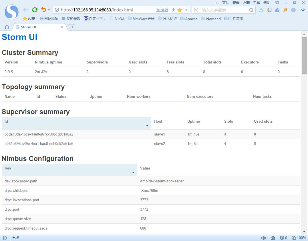 Nimbus对应的主机是192.168.95.134是Storm主节点,其余两台从节点Supervisor对应的主机分别是192.168.95.135(主机名:slave1)、192.168.95.136(主机名:slave2)。同样的,Zookeeper集群也是部署在上述节点上。Storm集群和Zookeeper集群会互相通信,因为Storm就是基于Zookeeper的。然后先启动每个节点的Zookeeper服务,其次分别启动Storm的Nimbus、Supervisor服务。具体可以到Storm安装的bin目录下面启动服务,启动命令分别为storm nimbus > /dev/null 2 > &1 &和storm supervisor > /dev/null 2 > &1 &。然后用jps观察启动的效果。没有问题的话,在Nimbus服务对应的主机上启动Storm UI监控对应的服务,在Storm安装目录的bin目录输入命令:storm ui >/dev/null 2>&1 &。然后打开浏览器输入:http://{Nimbus服务对应的主机ip}:8080,这里就是输入:http://192.168.95.134:8080/。观察Storm集群的部署情况,如下图所示: