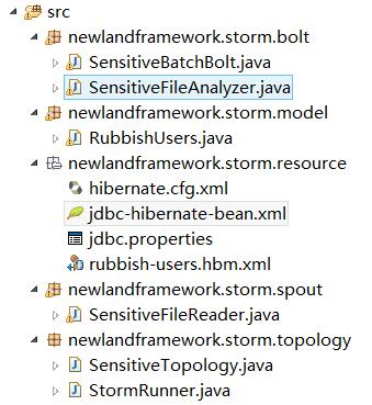 现在,我们对于整个敏感信息采集过滤监控的拓扑结构,有了一个整体的了解之后,我们再来看下如何具体编码实现!先来看下整个工程的代码层次结构,它如下图所示: