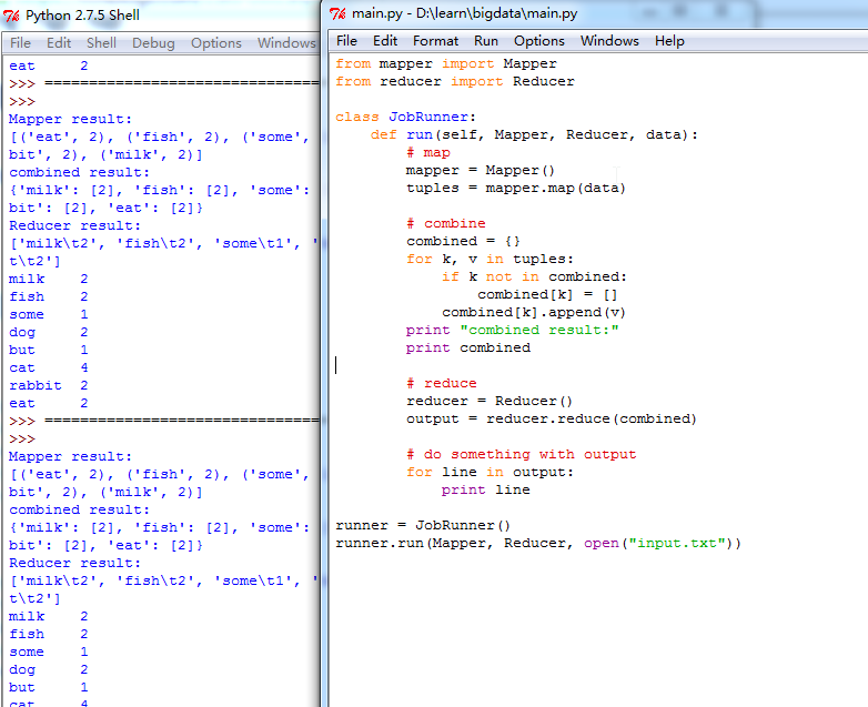 class Reducer: def reduce(self, d): returnval = [] for k, v in d.iteritems(): returnval.append("%s\t%s"%(k, sum(v))) print "Reducer result:" print returnval return returnval