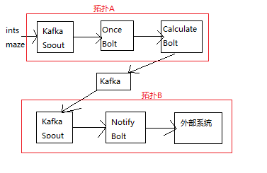 交易数据会发送到kafka,然后拓扑A去kafka取数据进行处理,拓扑A中的OnceBolt会先对从kafka取出的消息进行一个唯一性过滤(根据该消息的全局id判断该消息是否存储在redis中,如果有,则说明拓扑A已经对该消息处理过了,则不会把该消息发送该下游的calculateBolt,直接向spout发送ack响应;如果没有,则把该消息发送该下游的calculateBolt。),calculateBolt对接收到来自上游的数据进行规则的匹配,根据该消息所符合的规则推送到不同的kafka通知主题中。