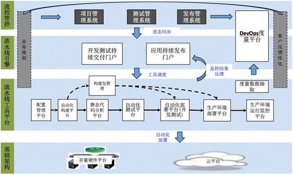 基础架构层是一个企业最基本的基础设施,既包含了存量的硬件平台,也包含了云计算平台,首先,只有在基础实施上实现弹性可伸缩、消除开发测试环境的差异,才能实现真正的 DevOps。而流水线工具平台则是为企业的代码开发、测试及发布提供了一个端到端的工具平台,通过该工具平台的自动化和相互间的无缝对接,实现了从软件代码配置管理、自动化构建、测试到快速的自动化发布。流水线工具分布在整个开发测试发布过程的各个阶段,需要不同的角色在不同的阶段进行配合操作,而且这个操作过程需要置于企业现有流程管控系统的管控之下,因此,我们还需要流水线引擎层,用于根据整体开发测试发布不同阶段的需要,驱动底层的工具平台进行产品的代码管理、构建及部署,同时对上又与企业的流程管控系统对接,使得整个操作过程置于流程监控之下。