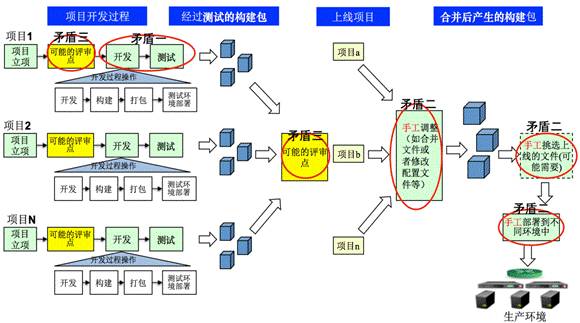 从开发团队的角度,其根本目的就是满足业务方的需求,能够快速的将开发完成的功能发布到生产环境中,特别是在业务部门对发布频率加快的需求与日俱增的压力下,他们对于开发测试发布流程中所存在的各个管控点就往往颇具怨言,认为有些把控环节不仅延缓了发布时间,而且还浪费了他们的时间,他们希望流程越简单越好。而从项目管理及运维的角度,在每年发布的几千甚至上万个版本中,只要其中有一个版本存在问题或者发布失误,就是难以容忍的,因此,为了防止可能存在的风险,在现有大量依靠手工操作的现实下,他们必须千方百计挖掘可能存在的风险点,并设置各种严格的评审点进行把关,以防止可能的风险流入到生产环境中。因此,现有由于风险管控所叠加上来的流程管控已经无法满足开发团队对于流程简单性及快速性的需求。