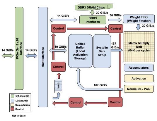 “矩阵乘法单元的权重通过片上的权重FIFO(Weight FIFO)进行缓存,该FIFO从片外8 GiB DRAM读取。由于是用于推论,权重为只读。8 GiB可以同时支持许多模型。权重FIFO的深度是4个tile。中间结果保存在24 MiB片上统一缓冲区(Unified Buffer)中,可以作为矩阵乘法单元的输入。可编程DMA实现和CPU Host内存以及统一缓冲区传输数据。”