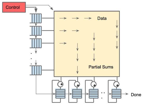 由于读取大的SRAM的能耗比算术运算高的多,所以矩阵单元通过减少统一缓冲区的读写来降低能耗,所谓脉动运行(systolic execution)。下图显示了数据从左侧流入,权重从顶部加载。给定的256-element乘累加运算通过矩阵作为对角波前(diagonal wavefront)移动。权重被预加载,并且与新块的第一数据一起在前进波上生效。控制和数据是流水线方式,所以好像给出256个输入是一次读取的,并且它们可以立即更新256个累加器中的每一个的一个位置。从正确性的角度来看,矩阵单元的脉动性对软件的是透明的。但是对于性能,它的延迟是软件需要考虑的因素。