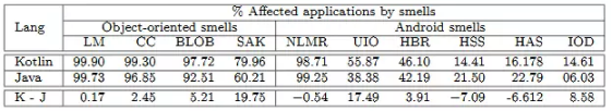 在面向对象的反模式中,LM,CC 和 BLOB 出现在至少 92% 的 Kotlin 和 Java 应用中,其中 OO “异味”在 Kotlin 应用更为常见。但研究者发现,在这 Android“异味”中,Java 比 Kotlin 更容易受到三种“异味”的影响。
