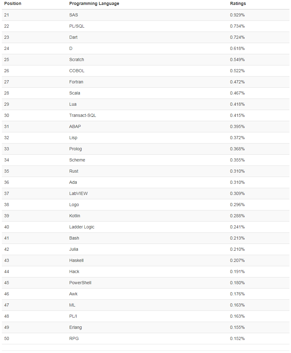 可以看到,微软家的 PowerShell 进入了排行榜的 TOP 50,虽然名次比较落后,但这是问世超过12年的它难得再次上榜。Powershell 通常用于编写 basic 脚本,直到最近它才适用于 Windows,但微软使用其 .NET Core 平台创建了 Powershell Core。而这个 PowerShell Core 版本是开源的,支持在所有主流平台上运行。这也可能也是它再次受欢迎的原因。