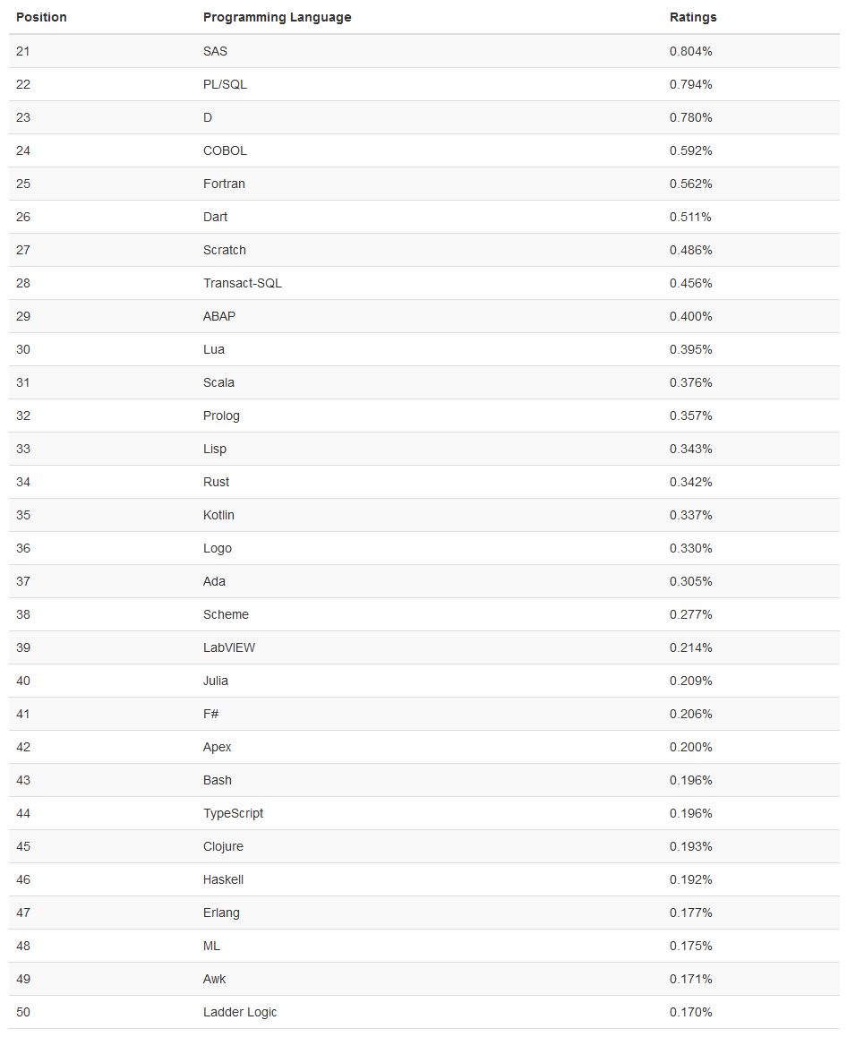 4th Dimension/4D, ABC, ActionScript, Alice, Avenue, BBC BASIC, bc, Bourne shell, C shell, CL (OS/400), Clipper, CoffeeScript, Common Lisp, Crystal, Elixir, Emacs Lisp, Factor, Forth, Hack, Haxe, Icon, Inform, Io, J#, Korn shell, LiveCode, Maple, Mercury, Monkey, MQL4, MS-DOS batch, NATURAL, OpenCL, OpenEdge ABL, PL/I, PostScript, PowerShell, Pure Data, Q, Red, Ring, RPG, S, Snap!, SPARK, Tcl, Tex, Vala/Genie, VBScript, VHDL