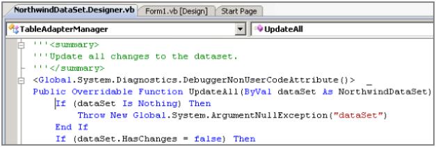 具有级联更新支持的强类型DataSet中,您只需调用我们新添加的TableAdapterManager组件的UpdateAll() 方法即可自动完成所有操作。它负责收集所有更改并将它们按正确顺序提交给服务器。当然,所有工作都会放在一个事务中。