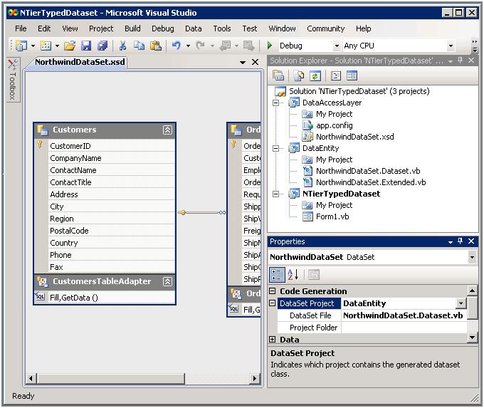 我承认,Visual Studio 2005 中生成强类型DataSet的代码并未对多层架构提供很好的支持。如果您打开强类型DataSet的代码文件,您会注意到我们已经很好的将类型从数据访问逻辑分开。DataSet和强类型的datatables是在一个强类型DataSet中声明的,而所有 TableAdapter 类则是在单独的命名空间中声明的。但是我们将它们放在了一个代码文件中。这对于大多数应用程序来说没有多大问题。但在构建多层架构的应用程序时, 将他们放在一个文件中并没有多少帮助。对该问题更细节方面的讨论请参考Steve Lasker的Splitting Typed Datasets from TableAdapters一文。他在该文中提出的解决方案是打开生成的代码并手动的将类型声明拷贝到一个新的类文件中。尽管这的确使得您可以在 N 层架构中使用强类型的DataSet。但是这个方案最大的缺憾就是由于需要您手动修改生成的代码,任何时候您在设计器中对强类型DataSet进行了更改,您就不得不再次拷贝类型声明部分的代码,很是繁琐。