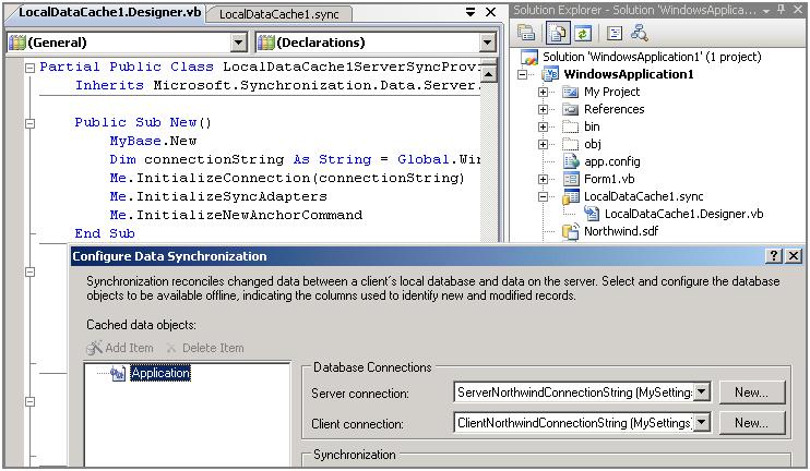 Visual Studio 2008包含了一个新的项目模板,叫做“本地数据缓存”。将“本地数据缓存”添加到您的项目中将会创建.sync的XML文件,该文件用于描述什么数据将被同步。此文件带有设计器以便您可以轻松地进行同步配置。设计器还会创建 SQL精简版数据库文件作为本地数据缓存,并生成与同步服务进行交互的代码。此特性的预览版在三月份的CTP of Visual Studio Orcas中就有,Beta 1版本中的该特性更加的完善。