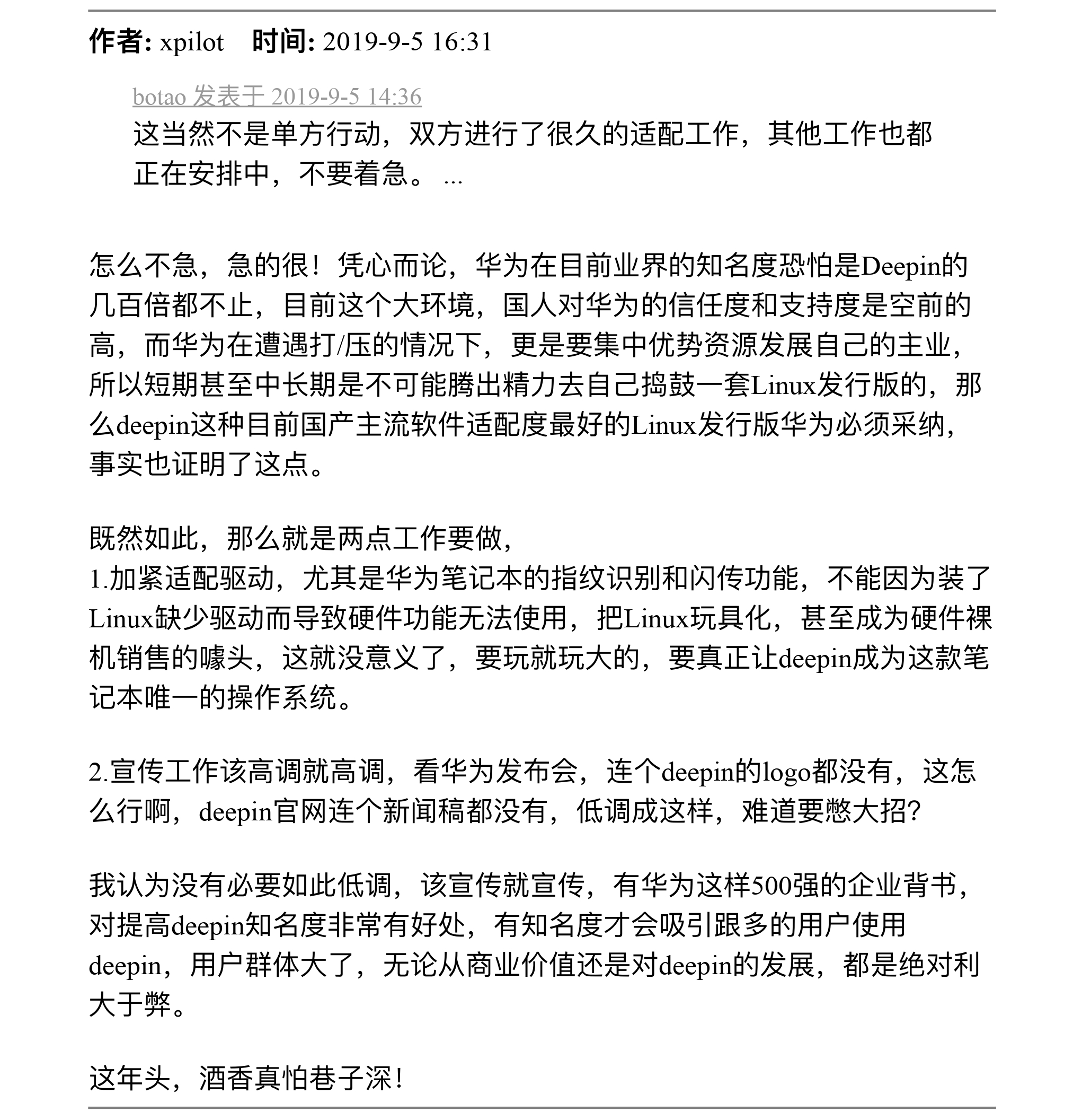 华为对深度 Linux 套件的适配工作也保持相当低调的态度。华为是否会更广泛地提供预装了深度 Linux 的产品,可能取决于其与美国政府的周旋结果。