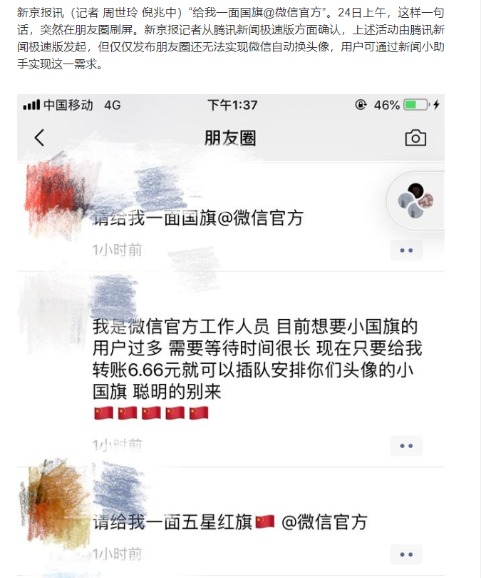 @罗马的王 :微信头像加了国旗就被套牢了,等国庆过了才可以换吧