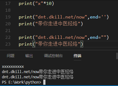 python输出多个重复字符,不需要自己手打N个*或者for循环输出多个重复字符,eg:print("x"*10)