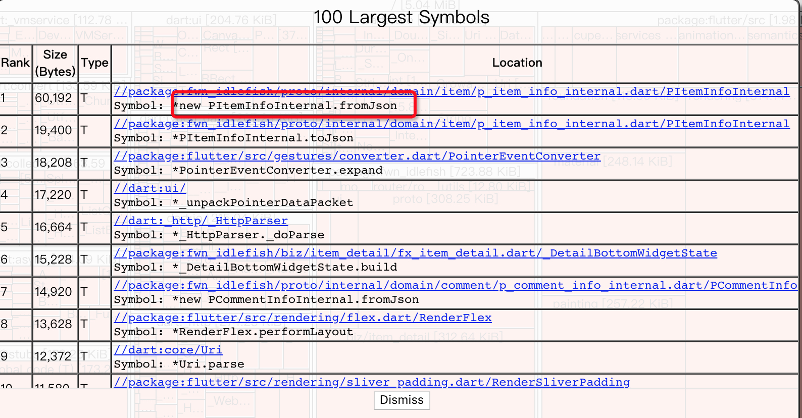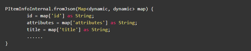 举个例子,上面的分析显示PItemInfoInternal.fromJson方法占用了大量体积,跟踪发现这个方法主要的操作是将Map数据转化成对象