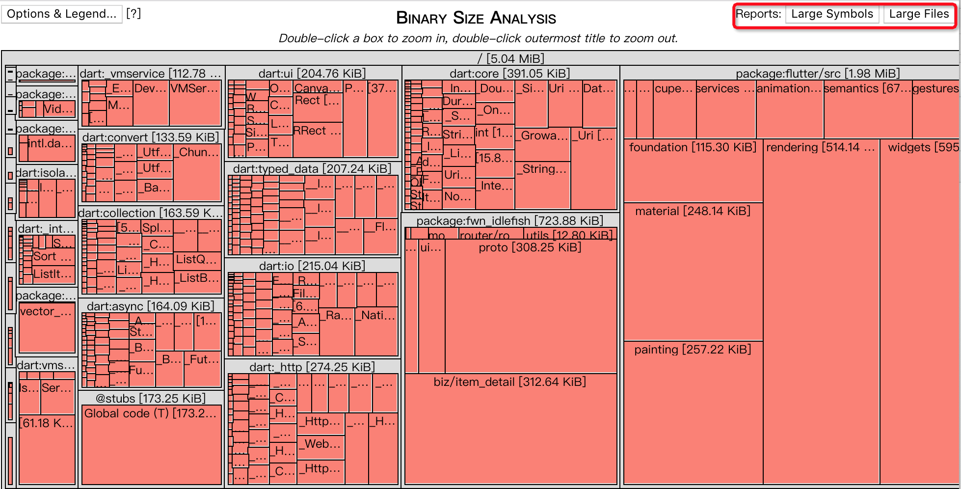 - 打开生成文件夹中的index.html即可分析具体业务所占用的大小,右上角的Large Symbols和Large Files按钮可以直接定位体积占比从大到小的方法/文件。