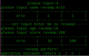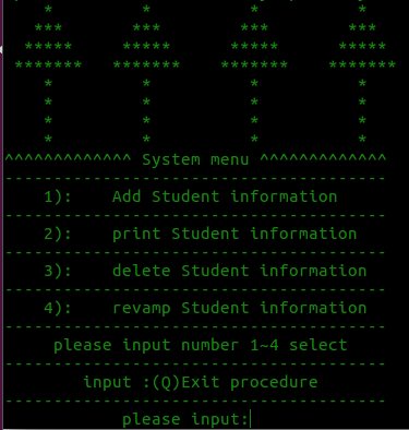 # 创建输出函数:student完成 临时菜单封装 def student(): for a in range(1, 8, 2): x = "*" * a print(x.center(9), x.center(10), x.center(10), x.center(9)) else: for y in range(1, 4 + 1): c = "*" if 4 >= 10: c = "***" print(c.center(9), c.center(10), c.center(10), c.center(9)) print("^^^^^^^^^^^^^ System menu ^^^^^^^^^^^^^") print("---------------------------------------") print(" 1): Add Student information ") print("---------------------------------------") print(" 2): print Student information ") print("---------------------------------------") print(" 3): delete Student information ") print("---------------------------------------") print(" 4): revamp Student information ") print("---------------------------------------") print(" please input number 1~4 select ") print("---------------------------------------") print(" input :(Q)Exit procedure ") print("---------------------------------------") # 创建输出函数:perform完成 # 创建输入函数:input_student开始 封装信息输入 def input_student(): L = [] print("--------Student information enty--------") while True: name = input("please input name:") if name == "": q = input("operation succeed! return y / n :") if q == "y": break else: input_student() age = input("please input age:") score = input("please input score:") d = {} d = {"name": name, "age": age, "score": score} print("+---------------+----------+----------+") name = d["name"].center(15) age = d["age"].center(10) score = d["score"].center(10) print('''|%s|%s|%s|''' % (name, age, score)) print("+---------------+----------+----------+") print("-----Not input Enter be no revamp!-----") L.append(d) return L # 创建输入函数:input_student完成 # 创建输出函数:output_student开始 封装列表打印 def output_student(lst): print("-------Student information sheet-------") print("+---------------+----------+----------+") print("| Name | Age | Score |") print("+---------------+----------+----------+") for d in lst: name = d["name"].center(15) age = d["age"].center(10) score = d["score"].center(10) print('''|%s|%s|%s|''' % (name, age, score)) print("+---------------+----------+----------+") q = input("operation succeed! return y / n :") if q == "y": pass else: output_student() # 创建输出函数:output_student完成 # 创建输出函数:delete_student开始 封装删除信息 def delete_student(lst): name = input("please input name delete:") for x in lst: if x["name"] == name: print("+---------------+----------+----------+") name = x["name"].center(15) age = x["age"].center(10) score = x["score"].center(10) print('''|%s|%s|%s|''' % (name, age, score)) print("+---------------+----------+----------+") delet = input("whether delete (y:yes/y:no):") if delet == "y": lst.remove(x) q = input("operation succeed! return y / n :") if q == "y": pass else: delete_student() # 创建输出函数:delete_student完成 # 创建输出函数:revamp_student()开始 封装更改信息 def revamp_student(lst): name = input("please input name revamp:") for x in lst: if x["name"] == name: print("+---------------+----------+----------+") name = x["name"].center(15) age = x["age"].center(10) score = x["score"].center(10) print('''|%s|%s|%s|''' % (name, age, score)) print("+---------------+----------+----------+") print("-----not input Enter be no revamp!-----") rage = input("please input age revamp:") rscore = input("please input score revamp:") if rage != "": x["age"] = rage if rscore != "": x["score"] = rscore print("+---------------+----------+----------+") name = x["name"].center(15) age = x["age"].center(10) score = x["score"].center(10) print('''|%s|%s|%s|''' % (name, age, score)) print("+---------------+----------+----------+") print("-----------revamp perform!------------") else: print("None Error") q = input("operation succeed! return y / n :") if q == "y": pass else: revamp_student() # 创建输出函数:revamp_student()完成 # 创建输出函数:System_menu()开始 临时封装系统 def System_menu(): L = [] while True: student() select = input(" please input:") if select == '1': L += input_student() elif select == '2': output_student(L) elif select == '3': delete_student(L) elif select == '4': revamp_student(L) elif select == 'q': break # 创建输出函数:System_menu()完成 临时封装系统 # 运行 System_menu()