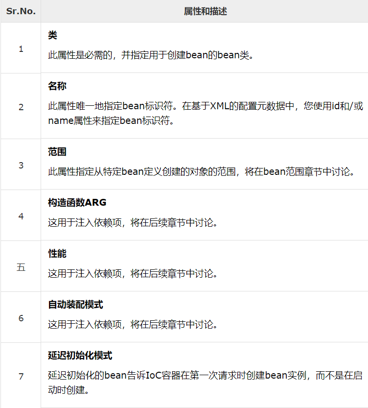 所有上述配置元数据都转换为构成每个bean定义的以下属性集。