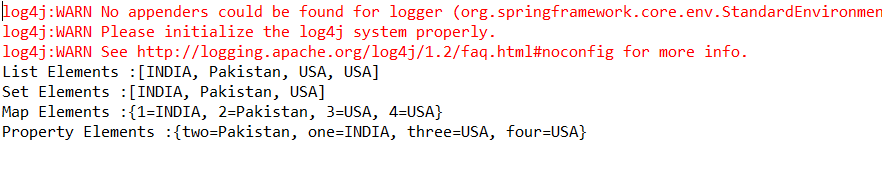 <?xml version = "1.0" encoding = "UTF-8"?> <beans xmlns = "http://www.springframework.org/schema/beans" xmlns:xsi = "http://www.w3.org/2001/XMLSchema-instance" xsi:schemaLocation = "http://www.springframework.org/schema/beans http://www.springframework.org/schema/beans/spring-beans-4.0.xsd"> <!-- Definition for javaCollection --> <bean id = "javaCollection" class = "com.tutorialspoint.JavaCollection"> <!-- results in a setAddressList(java.util.List) call --> <property name = "addressList"> <list> <value>INDIA</value> <value>Pakistan</value> <value>USA</value> <value>USA</value> </list> </property> <!-- results in a setAddressSet(java.util.Set) call --> <property name = "addressSet"> <set> <value>INDIA</value> <value>Pakistan</value> <value>USA</value> <value>USA</value> </set> </property> <!-- results in a setAddressMap(java.util.Map) call --> <property name = "addressMap"> <map> <entry key = "1" value = "INDIA"/> <entry key = "2" value = "Pakistan"/> <entry key = "3" value = "USA"/> <entry key = "4" value = "USA"/> </map> </property> <!-- results in a setAddressProp(java.util.Properties) call --> <property name = "addressProp"> <props> <prop key = "one">INDIA</prop> <prop key = "one">INDIA</prop> <prop key = "two">Pakistan</prop> <prop key = "three">USA</prop> <prop key = "four">USA</prop> </props> </property> </bean> </beans>