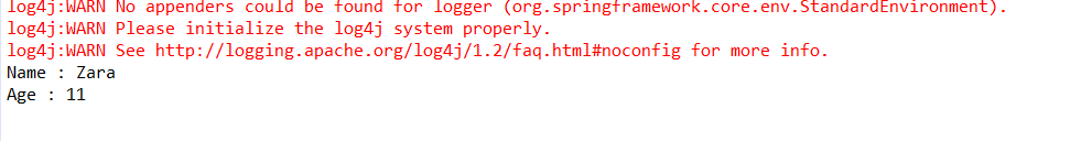 package com.tutorialspoint; import org.springframework.context.ApplicationContext; import org.springframework.context.support.ClassPathXmlApplicationContext; public class MainApp { public static void main(String[] args) { ApplicationContext context = new ClassPathXmlApplicationContext("Beans.xml"); Student student = (Student) context.getBean("student"); System.out.println("Name : " + student.getName() ); System.out.println("Age : " + student.getAge() ); }}