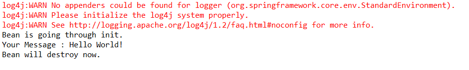 <?xml version = "1.0" encoding = "UTF-8"?> <beans xmlns="http://www.springframework.org/schema/beans" xmlns:xsi="http://www.w3.org/2001/XMLSchema-instance" xmlns:context="http://www.springframework.org/schema/context" xsi:schemaLocation="http://www.springframework.org/schema/beans http://www.springframework.org/schema/beans/spring-beans-4.0.xsd http://www.springframework.org/schema/context http://www.springframework.org/schema/context/spring-context-4.0.xsd"> <context:annotation-config/> <bean id="helloWorld" class="com.tutorialspoint.HelloWorld" init-method="init" destroy-method="destroy"> <property name="message" value="Hello World!"/> </bean> </beans>