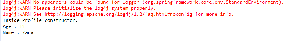<?xml version = "1.0" encoding = "UTF-8"?> <beans xmlns="http://www.springframework.org/schema/beans" xmlns:xsi="http://www.w3.org/2001/XMLSchema-instance" xmlns:context="http://www.springframework.org/schema/context" xsi:schemaLocation="http://www.springframework.org/schema/beans http://www.springframework.org/schema/beans/spring-beans-4.0.xsd http://www.springframework.org/schema/context http://www.springframework.org/schema/context/spring-context-4.0.xsd"> <context:annotation-config/> <!-- Definition for student bean --> <bean id="student" class="com.tutorialspoint.Student"> <property name="name" value="Zara" /> <!-- try without passing age and check the result --> <property name="age" value="11"/> </bean> </beans>