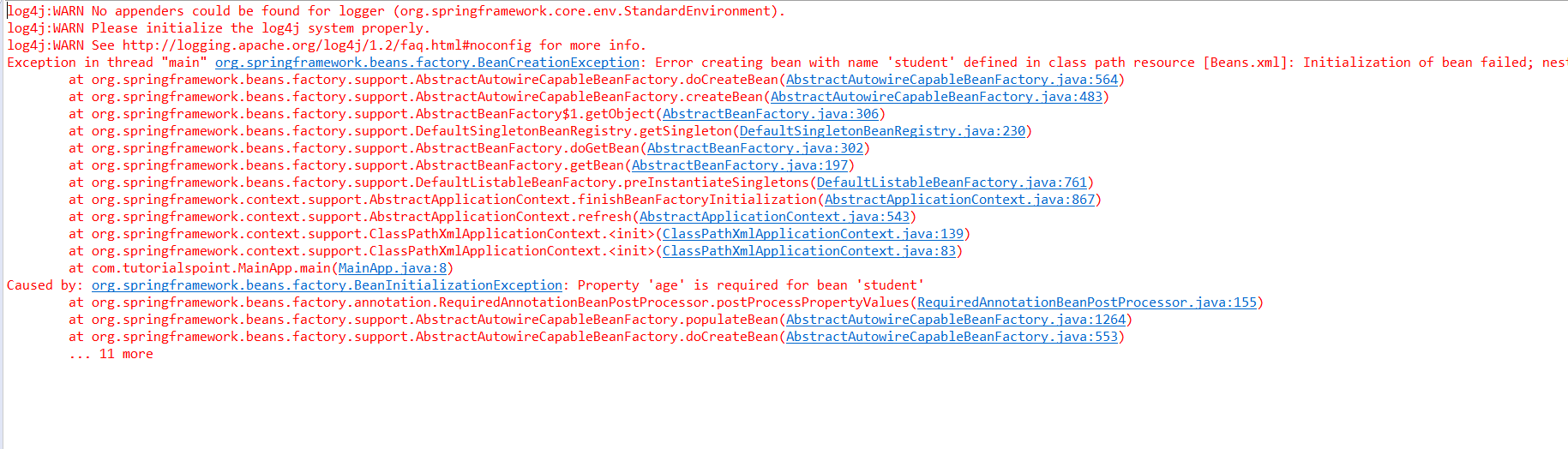 package com.tutorialspoint; import org.springframework.beans.factory.annotation.Required; public class Student { private Integer age; private String name; @Required public void setAge(Integer age) { this.age = age; } public Integer getAge() { return age; } @Required public void setName(String name) { this.name = name; } public String getName() { return name; } }