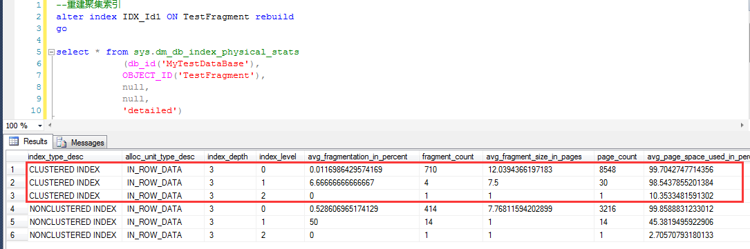这里重建聚集索引之后,重新观察索引碎片情况,看截图sys.dm_db_index_physical_stats的查询结果