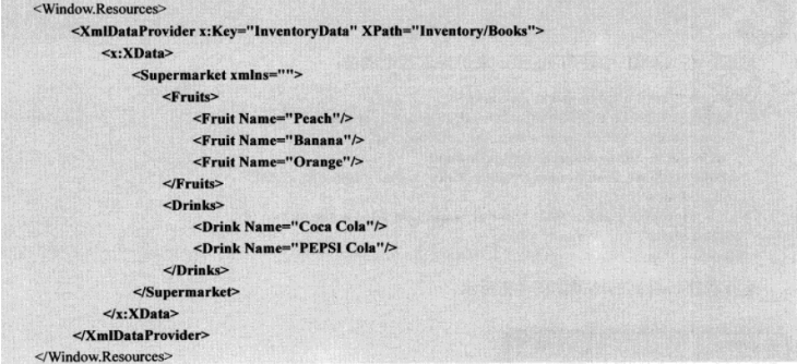 x:XData是一个专用标签。WPF把包含数据的对象称为数据源,用于把数据源中的数据提供给数据使用者的对象被称做是数据提供者,WPF中包含多种数据提供者,其中一个类名叫做XmlDataProvider实例,那么XmlDataProvider实例的数据就要放在x:XData的标签内容里。事例如下: