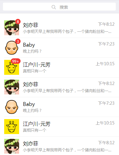 <!DOCTYPE html> <html lang="zh-CN"> <head> <meta charset="UTF-8"> <meta name="viewport" content="width=device-width,initial-scale=1,user-scalable=0"> <title>WeUI</title> <link rel="stylesheet" href="css/weui.min.css"> <link rel="stylesheet" href="css/demos.css"> <link rel="stylesheet" type="text/css" href="css/jquery-weui.css"/> <style type="text/css"> .badge-position{ position: absolute; top: -.4em; right: -.4em; } </style> </head> <body ontouchstart> <!-- Your Code --> <div class="page__pd"> <div class="weui-search-bar" id="searchBar"> <form class="weui-search-bar__form" action="#"> <div class="weui-search-bar__box"> <i class="weui-icon-search"></i> <input type="search" class="weui-search-bar__input" id="searchInput" placeholder="搜索" required=""> <a href="javascript:" class="weui-icon-clear" id="searchClear"></a> </div> <label class="weui-search-bar__label" id="searchText" style="transform-origin: 0px 0px 0px; opacity: 1; transform: scale(1, 1);"> <i class="weui-icon-search"></i> <span>搜索</span> </label> </form> <a href="javascript:" class="weui-search-bar__cancel-btn" id="searchCancel">取消</a> </div> <div class="weui-panel weui-panel_access"> <div class="weui-panel__bd"> <a href="javascript:void(0);" class="weui-media-box weui-media-box_appmsg"> <div class="weui-cell__bd"> <div class="weui-media-box__hd"> <img class="weui-media-box__thumb" src="img/avatar.jpg" alt=""> <span class="weui-badge badge-position" >8</span> </div> <div class="weui-media-box__bd"> <h4 class="weui-media-box__title"> 刘亦菲 <span class="weui-media-box__title-after">下午8:12</span> </h4> <p class="weui-media-box__desc">小李明天早上帮我带两个包子,一个猪肉粉丝和一个奶黄包</p> </div> </a> <a href="javascript:void(0);" class="weui-media-box weui-media-box_appmsg"> <div class="weui-media-box__hd"> <img class="weui-media-box__thumb" src="img/avatar2.jpg" alt=""> <span class="weui-badge" style="position: absolute;top: -.4em;right: -.4em;">3</span> </div> <div class="weui-media-box__bd"> <h4 class="weui-media-box__title"> Baby <span class="weui-media-box__title-after">下午7:23</span> </h4> <p class="weui-media-box__desc">晚上约吗?</p> </div> </a> <a href="javascript:void(0);" class="weui-media-box weui-media-box_appmsg"> <div class="weui-media-box__hd"> <img class="weui-media-box__thumb" src="img/avatar3.jpg" alt=""> <span class="weui-badge" style="position: absolute;top: -.4em;right: -.4em;">99+</span> </div> <div class="weui-media-box__bd"> <h4 class="weui-media-box__title"> 江户川-元芳 <span class="weui-media-box__title-after">上午10:15</span> </h4> <p class="weui-media-box__desc">真相只有一个</p> </div> </a> <a href="javascript:void(0);" class="weui-media-box weui-media-box_appmsg"> <div class="weui-media-box__hd"> <img class="weui-media-box__thumb" src="img/avatar.jpg" alt=""> </div> <div class="weui-media-box__bd"> <h4 class="weui-media-box__title"> 刘亦菲 <span class="weui-media-box__title-after">下午8:12</span> </h4> <p class="weui-media-box__desc">小李明天早上帮我带两个包子,一个猪肉粉丝和一个奶黄包</p> </div> </a> <a href="javascript:void(0);" class="weui-media-box weui-media-box_appmsg"> <div class="weui-media-box__hd"> <img class="weui-media-box__thumb" src="img/avatar2.jpg" alt=""> </div> <div class="weui-media-box__bd"> <h4 class="weui-media-box__title"> Baby <span class="weui-media-box__title-after">下午7:23</span> </h4> <p class="weui-media-box__desc">晚上约吗?</p> </div> </a> <a href="javascript:void(0);" class="weui-media-box weui-media-box_appmsg"> <div class="weui-media-box__hd"> <img class="weui-media-box__thumb" src="img/avatar3.jpg" alt=""> </div> <div class="weui-media-box__bd"> <h4 class="weui-media-box__title"> 江户川-元芳 <span class="weui-media-box__title-after">上午10:15</span> </h4> <p class="weui-media-box__desc">真相只有一个</p> </div> </a> <a href="javascript:void(0);" class="weui-media-box weui-media-box_appmsg"> <div class="weui-media-box__hd"> <img class="weui-media-box__thumb" src="img/avatar.jpg" alt=""> </div> <div class="weui-media-box__bd"> <h4 class="weui-media-box__title"> 刘亦菲 <span class="weui-media-box__title-after">下午8:12</span> </h4> <p class="weui-media-box__desc">小李明天早上帮我带两个包子,一个猪肉粉丝和一个奶黄包</p> </div> </a> <a href="javascript:void(0);" class="weui-media-box weui-media-box_appmsg"> <div class="weui-media-box__hd"> <img class="weui-media-box__thumb" src="img/avatar2.jpg" alt=""> </div> <div class="weui-media-box__bd"> <h4 class="weui-media-box__title"> Baby <span class="weui-media-box__title-after">下午7:23</span> </h4> <p class="weui-media-box__desc">晚上约吗?</p> </div> </a> <a href="javascript:void(0);" class="weui-media-box weui-media-box_appmsg"> <div class="weui-media-box__hd"> <img class="weui-media-box__thumb" src="img/avatar3.jpg" alt=""> </div> <div class="weui-media-box__bd"> <h4 class="weui-media-box__title"> 江户川-元芳 <span class="weui-media-box__title-after">上午10:15</span> </h4> <p class="weui-media-box__desc">真相只有一个</p> </div> </a> <a href="javascript:void(0);" class="weui-media-box weui-media-box_appmsg"> <div class="weui-media-box__hd"> <img class="weui-media-box__thumb" src="img/avatar.jpg" alt=""> </div> <div class="weui-media-box__bd"> <h4 class="weui-media-box__title"> 刘亦菲 <span class="weui-media-box__title-after">下午8:12</span> </h4> <p class="weui-media-box__desc">小李明天早上帮我带两个包子,一个猪肉粉丝和一个奶黄包</p> </div> </a> <a href="javascript:void(0);" class="weui-media-box weui-media-box_appmsg"> <div class="weui-media-box__hd"> <img class="weui-media-box__thumb" src="img/avatar2.jpg" alt=""> </div> <div class="weui-media-box__bd"> <h4 class="weui-media-box__title"> Baby <span class="weui-media-box__title-after">下午7:23</span> </h4> <p class="weui-media-box__desc">晚上约吗?</p> </div> </a> <a href="javascript: