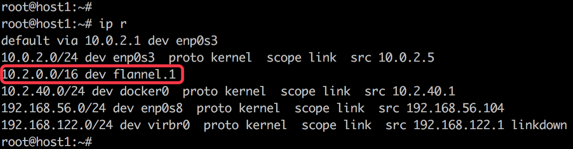 根据 host1 的路由表(下图),数据包会发给 flannel.1。