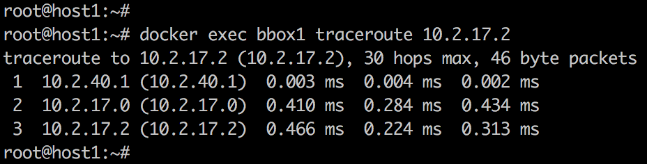 bbox1 与 bbox2 不是一个 subnet,数据包发送给默认网关 10.2.40.1(docker0)。